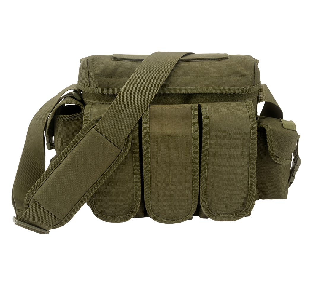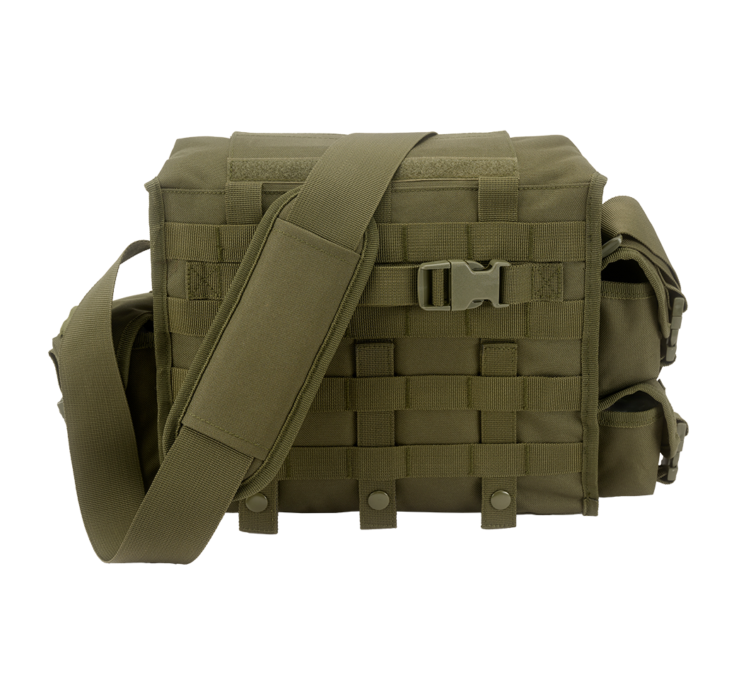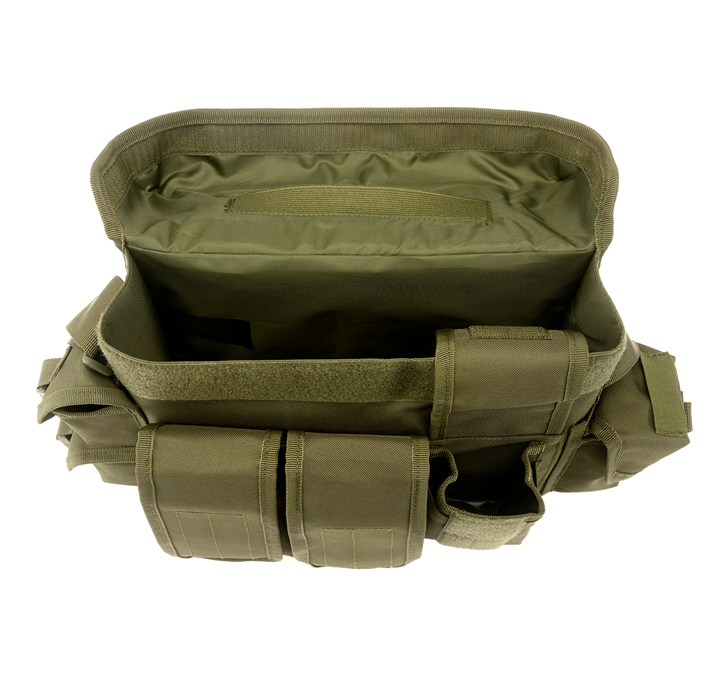 multifunktionale Tasche aus 600D Polyester / 1 großes Hauptfach / praktischer Schnellzugriff über Taschendeckel / Klettschließe / 3 frontal aufgesetzte Taschen mit Klettschließe / 3 seitliche kleine Taschen mit Klettschließe und zusätzlichem Klippverschluss / längenverstellbarer Schultergurt mit gepolsterter Schulterauflage / Molle-System / justierbarer Kompressionsgurt